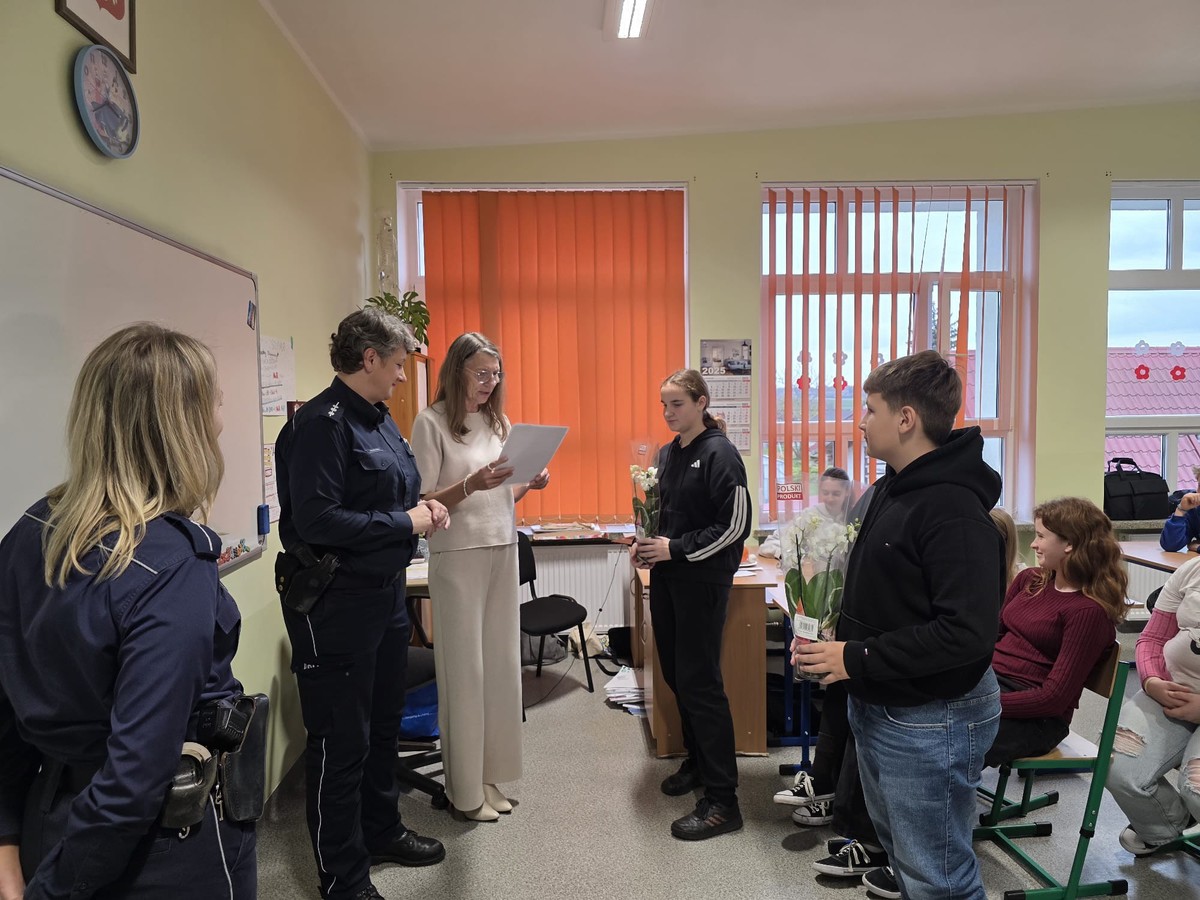 W piątek (14.11.25 r.), dzielnicowa z Komendy Powiatowej Policji w Bartoszycach odwiedziła szkołę, w której uczą się jej dzieci. Została zaproszona przez wychowawców, by opowiedzieć o służbie w policji kolegom i koleżankom jej córki i syna. 17-lat służby, to spory bagaż doświadczeń, wiec dzielnicowa miała, o czym opowiadać. Młodzież była zaciekawiona, zwłaszcza informacjami o konkretnych „akcjach”, w których brała udział policjanta. Uczniowie byli przygotowani i mieli dużo pytań na temat policji i jej funkcjonowania, z którymi przyszło się zmierzyć dzielnicowej. To było udane, pełne pozytywnej energii spotkanie z policjantką, ale przede wszystkim mamą, mamą kolegi i koleżanki i dobrze znaną Panią z sąsiedztwa.